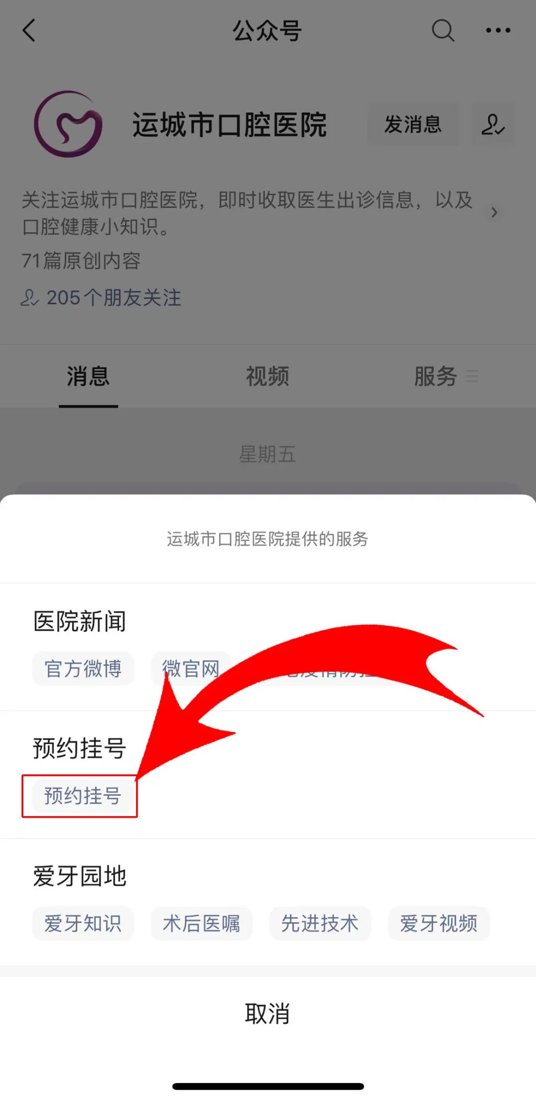 1.進入【運城市口腔醫(yī)院】訂閱號主界面;