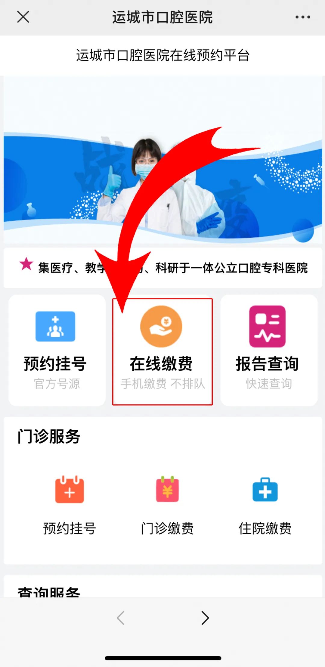 2.點擊【服務(wù)】— 預(yù)約掛號 — 進入【運城市口腔醫(yī)院在線預(yù)約平臺】;